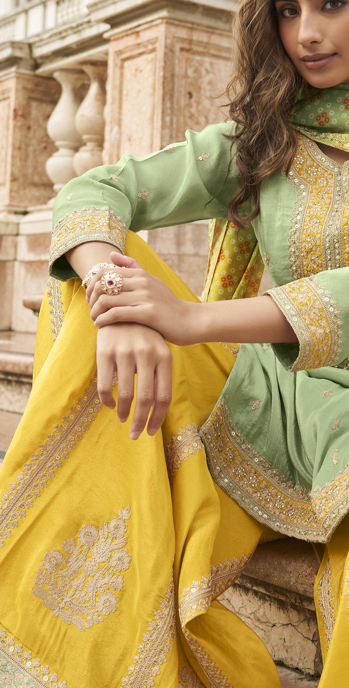Destination wedding wear palazzo kameez dupatta traditional dress. Green yellow jacquard viscose silk stitched fashionable suit. Designer festive mehendi attire. Moti, sequins, stones, resham zari thread embroidered short kurta available in sizes 36" and 40" bust with 2" margin. It's paired with a customized yellow silk sharara style bottom with work available in waist sizes 30"-32" and 34"-36" and length 40"-42". Multicoloured bandhani silk dupatta.