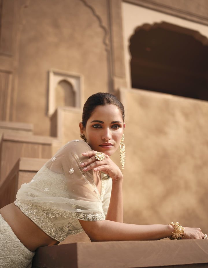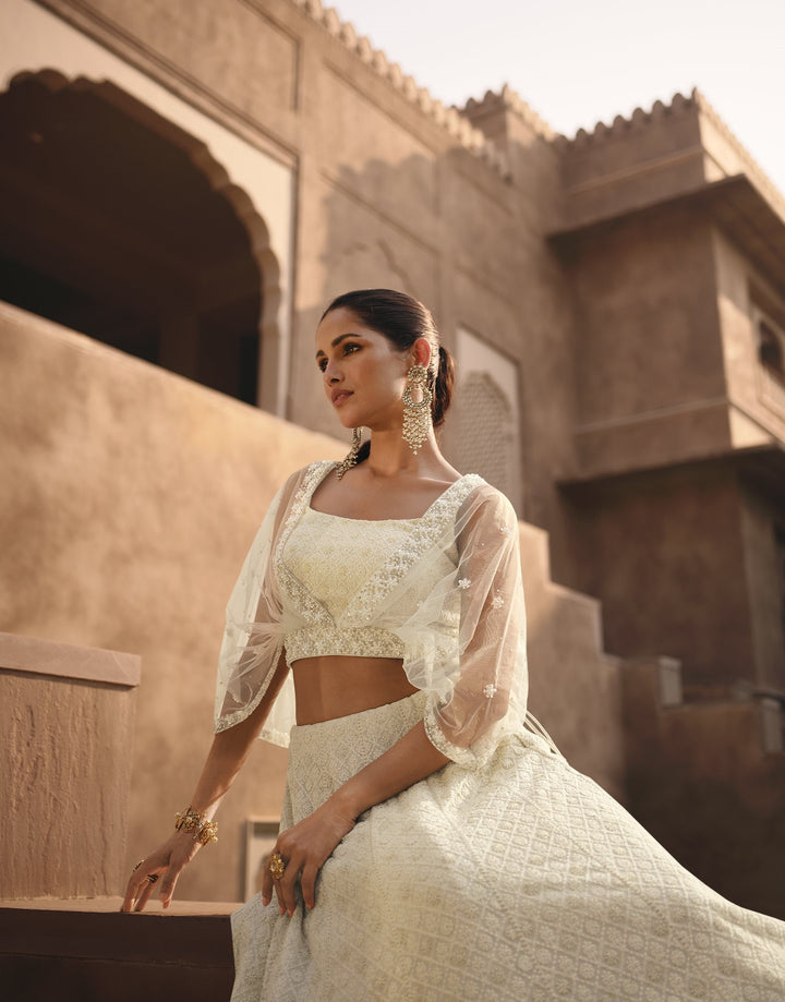 Celebration wear indo western designer dress. White georgette lengha crop top shrug set. Shaadi engagement party readymade stylish fusion attire. Ceremonial bridesmaid outfit. Sequins, moti, zari resham thread embroidered ghaghra available...