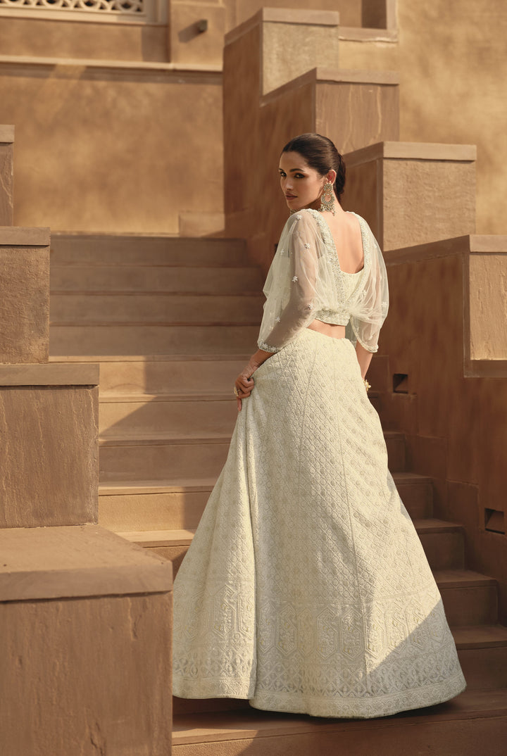 Celebration wear indo western designer dress. White georgette lengha crop top shrug set. Shaadi engagement party readymade stylish fusion attire. Ceremonial bridesmaid outfit. Sequins, moti, zari resham thread embroidered ghaghra available in sizes M, L, XL, XXL. It's paired with a ready crop top blouse and ornated shrug.